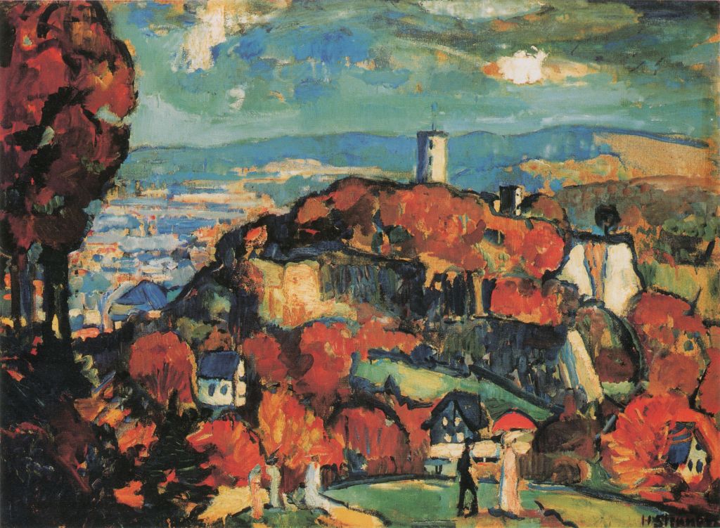Ab dem Wintersemester 1911 studierte Hermann Stenner weiter in Stuttgart, nun bei Adolf Hölzel (1853-1934), der ihn im März 1912 zum Meisterschüler mit eigenem Atelier macht. Hölzel hatte es zu seinem Prinzip gemacht, seine Schüler so wenig wie möglich zu korrigieren, um ihre persönliche Ausdrucksstärke nicht zu verfälschen. Zugleich aber versuchte Hölzel in vielen Pflichtvorlesungen fundamentale Regeln der Malerei zu vermitteln. „Stenners unbekümmertes Drauflosmalen wurde von Hölzel in geordnete Bahnen gelenkt“, schreibt Karin von Maur dazu. Hölzel bot immer wieder Exkursionen an, die Hermann Stenner gerne wahrnahm, sofern sein Budget dies zuließ. Diese Exkursionen führten Stenner 1912 nach Monschau und 1913 nach Schleißheim. Auf dem Weg nach Monschau machte man einen Stopp in Köln, um die „Internationale Kunstausstellung des Sonderbundes“ zu sehen, wo von van Gogh über Cézanne bis Picasso die gesamte europäische Moderne erstmals umfassend in Deutschland zu sehen war. Mit den Kommilitonen und Kollegen fuhr Stenner 1912 für mehrere Wochen nach Paris, im Frühjahr 1914 mit Oskar Schlemmer (1888-1943) und Willi Baumeister (1889-1955) nach Amsterdam. Die drei Künstler hatten zuvor erfolgreich den von Prof. Hölzel vermittelten Auftrag abgeschlossen, zwölf Wandbilder mit dem Thema der „Legende der heiligen Ursula“ für die Haupthalle der „Deutschen Werkbund-Ausstellung Cöln“ zu entwerfen und zu malen. In der weiteren Auseinandersetzung mit religiösen Themen gelang Hermann Stenner mit dem Ölgemälde „Auferstehung“ ein Höhepunkt seines malerischen Schaffens. Und sogar in der Heimat fand der Maler endlich größere Beachtung: Die erste Einzelausstellung mit Werken von Hermann Stenner fand im Oktober 1913 in der „Handwerker- und Kunstgewerbeschule“ in Bielefeld statt.