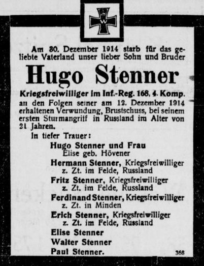 Am 11. Januar 1915 ließen die Eltern von Hermann Stenner, der Bielefelder Malermeister Hugo Christian Friedrich Stenner (1869-1918) und seine Ehefrau Wilhelmine Elise Stenner geb. Hövener (1870-1949) sowohl in der Westfälischen Zeitung wie auch im Bielefelder General-Anzeiger eine Todesanzeige veröffentlichen, um den Tod ihres ältesten Sohnes Hugo Stenner (1893-1914) zu beklagen. Er war am 12. Dezember 1914 bei Lowitsch (Rußland) bei seinem ersten Sturmangriff in die Brust getroffen worden und am 30. Dezember 1914 seinen schweren Verletzungen erlegen.