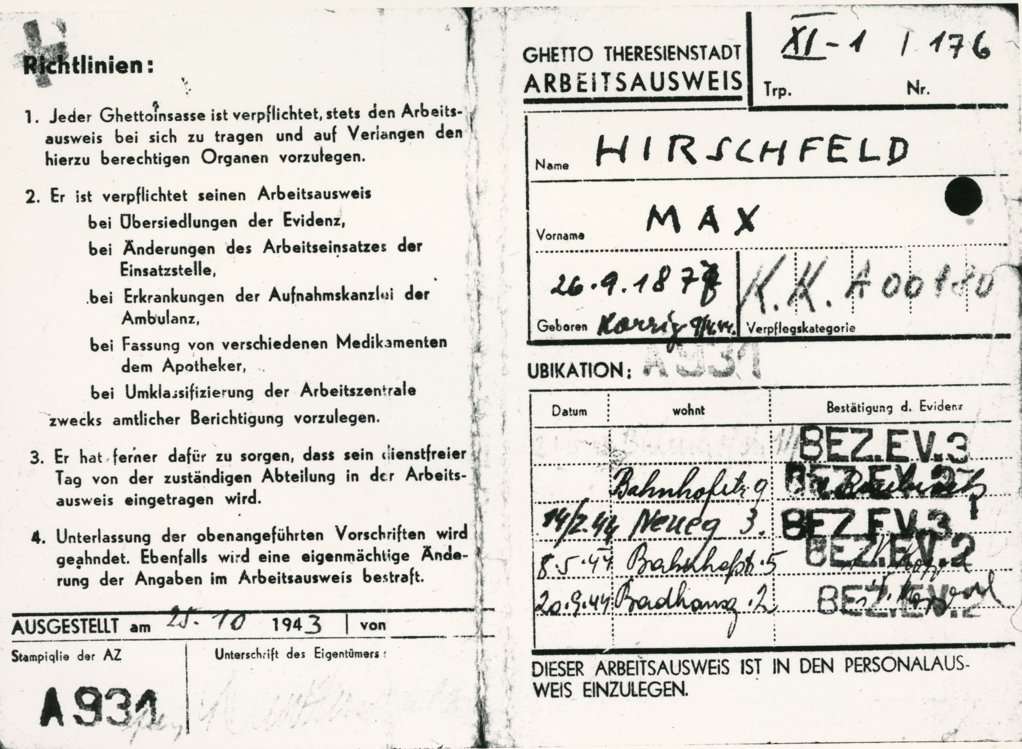 „Alle im dortigen Bereich [Reg.Bez. Minden, Lippe, Schaumburg-Lippe] lebenden staatsangehörigen (DR) und staatenlosen Juden, Jüdinnen und Geltungsjuden sind – ungeachtet z. Zt. Bestehender Arbeitsverhältnisse – sofort zum geschlossenen Arbeitseinsatz nach Theresienstadt zu bringen. Ausgenommen sind lediglich alle nicht mehr Transportfähigen. […] Die in Frage kommenden Personen sind bis spätestens Montag, den 12.2.45 nach Bielefeld, Hotel „Stadt Bremen“, Bahnhof- Ecke Zimmerstr., Eingang Zimmerstr., zu überführen. Ausnahmen von dem Arbeitseinsatz sind grundsätzlich nicht zu machen. Gepäck kann im üblichen Umfang mitgenommen werden. Marschverpflegung ist für etwa 8 Tage mitzubringen.“