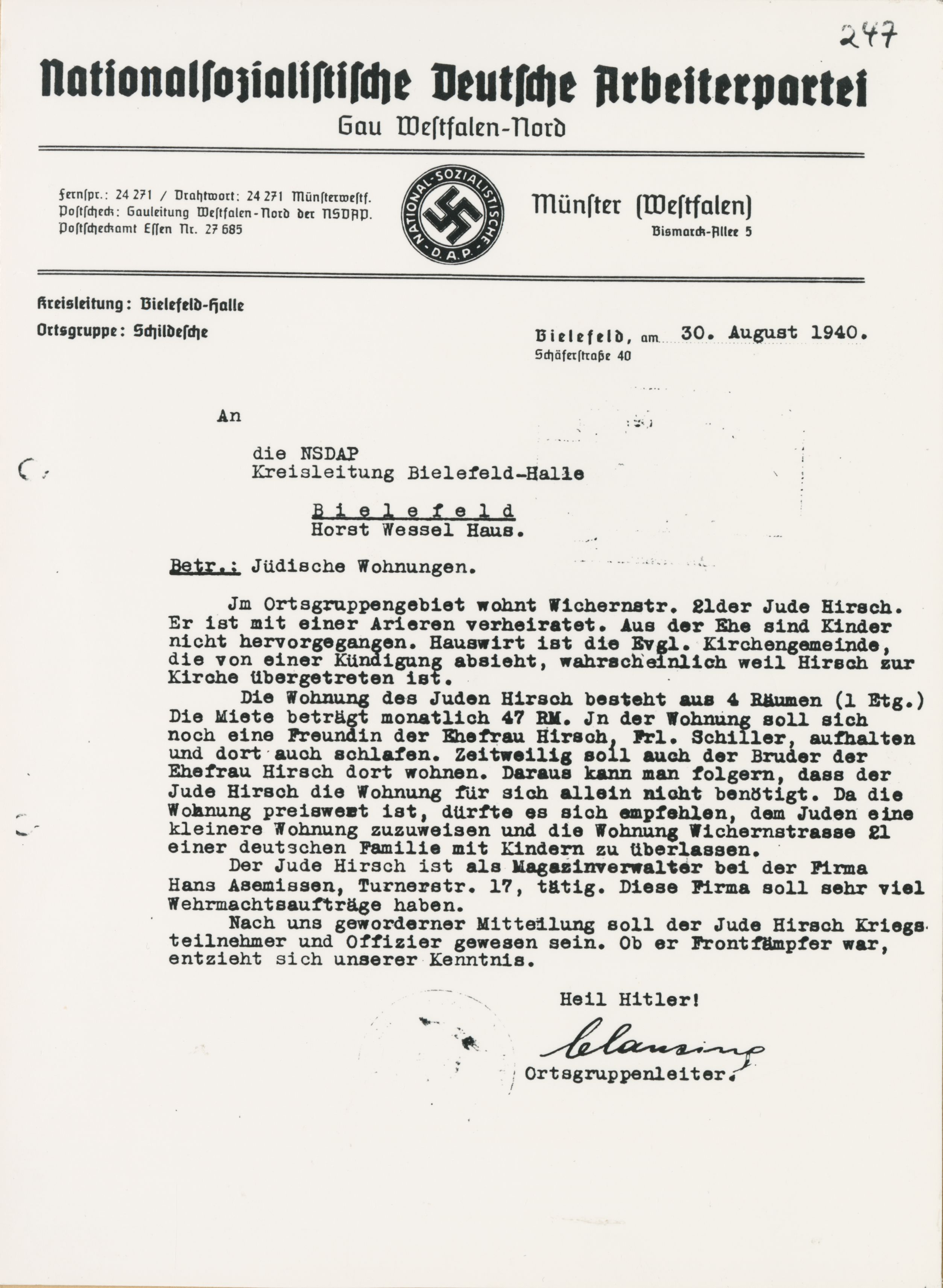 „Ich bitte den Kreissonderhilfeausschuss mich unbedingt dagegen in Schutz zu nehmen, dass ehemalige Nationalsozialisten auch jetzt noch mit mir, einem 64-jährigen Manne, der seit 1933 verfolgt, um Existenz, Besitz und Gesundheit gebracht worden ist, umspringen können wie in der blühendsten Hitlerzeit! Ich bitte dringend durch ein Machtwort beim Wohnungsamt dahin wirken zu wollen, dass man uns endlich in Ruhe lässt, denn ich kann nicht mehr mithalten!“