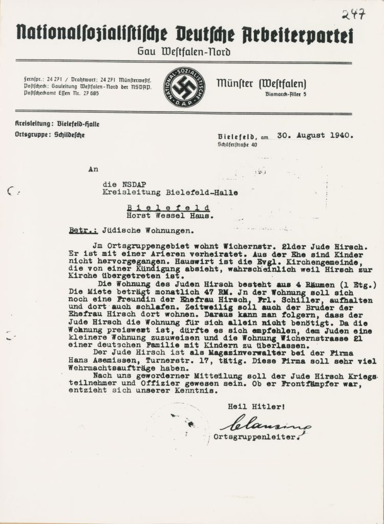 Der 26. Juni 1943 markiert in Bielefeld eine Zäsur: Es endeten die Deportationen zur „Endlösung der Judenfrage“, wie es als Maßgabe auf der Wannseekonferenz am 20. Januar 1942 von den Vertretern der Ministerien und der NS-Bürokratie beschlossen wurde. Mit den letzten Deportationen von „Volljuden“ wurden reichsweit die Büros der Reichsvereinigung der Juden in Deutschland (RVJD) geschlossen – die unter Zwang gebildeten und agierenden Lokalorganisationen mussten die Gestapo bei der Durchführung der Deportationen unterstützen. Davon betroffen war auch die „Zweigstelle Westfalen“ in der Bielefelder Laerstraße 9. Ihr Vorsitzender Max Ostwald war – vermutlich in Folge eines internen Streits – schon ein Jahr zuvor nach Theresienstadt deportiert worden. Für Bielefeld lässt sich beobachten, dass im Mai und Juni 1943 die letzten geachteten und hochaltrigen „Volljuden“ deportiert wurden: Dr. Gustav Meyer und Albert Daltrop waren beispielsweise im Mai, im Juni folgen überwiegend die Bewohnerinnen und Bewohner des Altersheims an der Stapenhorststraße. Gleichzeitig wurden die letzten „Judenhäuser“ leergezogen, in denen die Bielefelder Jüdinnen und Juden seit 1939 mit dem Gesetz über Mietverhältnisse mit Juden („Entmietungsgesetz“) segregiert worden waren.
