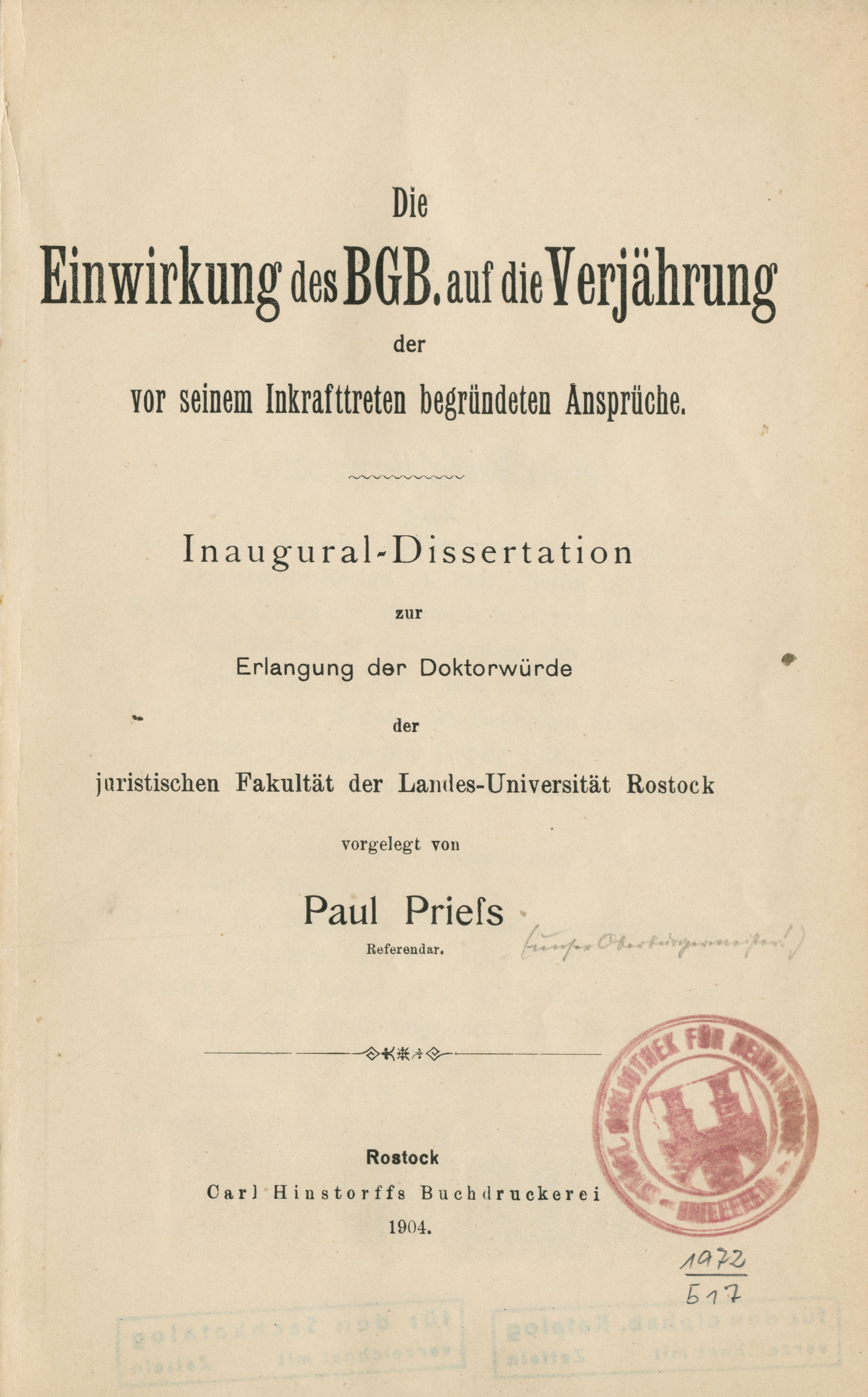 Am 15. April 1904 promovierte er mit einer Dissertation über „Die Einwirkung des BGB auf die Verjährung der vor seinem Inkrafttreten begründeten Ansprüche“ an der Universität Rostock zum Dr. jur. und legte am 2. Oktober 1907 die zweite juristische Staatsprüfung ab. Nachdem er am 2. Oktober 1906 Gerichtsassessor am Amtsgericht Witten geworden war, wechselte er am 1. Januar 1908 zur Stadtverwaltung Essen, wo er zunächst unentgeltlich informatorisch beschäftigt war, kurzzeitig eine Beigeordnetenvertretung übernahm, ab dem 1. November 1908 als juristischer Hilfsarbeiter und ab dem 1. Januar 1910 als Stadtassessor für juristische Angelegenheiten und Bearbeitung der Armen-, Waisen- und Wohlfahrtssachen beschäftigt war. Prieß war durchaus ambitioniert, schaute sich nach neuen Herausforderungen um, wobei er sich stets für die Kommunalverwaltung interessierte: 1909 bewarb er sich erfolglos auf Stellen in Osnabrück, Mühlheim/R. und Gelsenkirchen, 1910 in Gevelsberg.