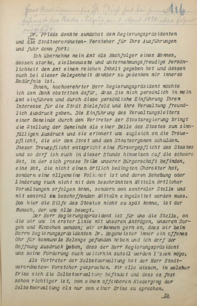 In seiner Antrittsrede diagnostizierte Prieß – für einige vielleicht überraschend – schonungslos, dass es richtiger sei, „von einem offenbaren Niedergang der Selbstverwaltung als nur von einer Krise zu sprechen.“ Prieß gestand Fehler in der Selbstverwaltung ein, die freilich überall vorgekommen seien – „es mag auch eine übersteigernde Politisierung in der Selbstverwaltung Platz gegriffen habe – die Arbeit wäre leichter ohne sie gewesen“. Die staatlichen Eingriffe in die städtische Finanzautonomie bei gleichzeitiger Unterdeckung der Erwerbslosenfürsorge habe die Kommunen in eine finanzielle Schieflage versetzt und eine „kommunalfeindliche Einstellung“ in den Medien erzeugt. Pessimistisch blickte Prieß auf bessere Zeiten mit Gestaltungsmöglichkeiten zurück: „Heute nichts von an all dem. Die nackte Not und die Sorge um das alltägliche Brot für viele unserer Volksgenossen stehen im Vordergrunde.“ Dennoch versprach der neue Amtsinhaber, sein Amt „objektiv und sachlich, unparteiisch und ohne Vorurteil“ zu verwalten. Mit diesem Versprechen ging der Verwaltungsfachmann an die Arbeit und in eine aufgeladene politische Zeit.
