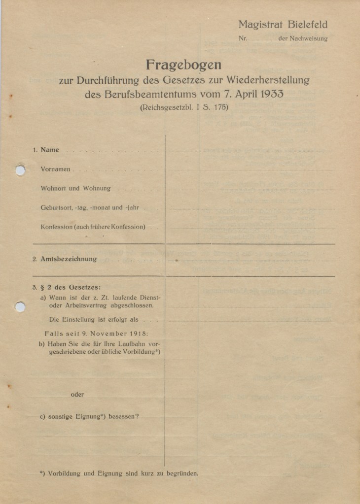 - Stadtarchiv Bielefeld, Bestand 103,3/Personalamt, Nr. 113: Gesetz zur Wiederherstellung des Berufsbeamtentums vom 7.4.1933, Spezielles, 1933-1936