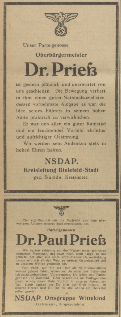 Lange Zeit war angenommen worden, dass Prieß im Amt geblieben war, ohne „Parteigenosse“ zu werden. Eine Traueranzeige des Amts für Beamte und Reichsbund der deutschen Beamten Bielefeld-Stadt bezeichnet Prieß am 26. März 1935 in den Lokalzeitungen jedoch als „Parteigenosse und Berufskamerad“ und rühmt seine „hervorragenden Eigenschaften als Nationalsozialist und Staatsdiener“. In den Westfälischen Neuesten Nachrichten vom 28. März 1935 heißt es darüber hinaus zur Trauerfeier: „der Ortsgruppenleiter der OG. Wittekind ruft dem toten Parteigenossen das letzte ´Heil Hitler´ nach“. Die Westfälische Zeitung schrieb am 28. März 1935 zum Auftritt des Gauinspekteurs Karl Heidemann (1895-1975) am Grab, er habe dem „Oberbürgermeister und Parteigenossen in bewegten Worten ein letztes Lebewohl“ nachgerufen. Auch das NS-Volksblatt für Westfalen und mehrere Bochumer Tageszeitungen bezeichnen Prieß in Beisetzungsberichterstattungen wiederholt als „Pg.“. Prieß´ Bielefelder Wohnung seit dem 1. April 1934 lag im Bereich der Ortsgruppe Wittekind, in deren Todesanzeige im NS-Volksblatt für Westfalen es am 25. März 1935 hieß, man trauere um einen „Parteigenossen“, der „noch nicht lange zu uns gehörte“. Das „noch nicht lange“ scheint weniger auf eine allgemeine Eigenschaft als „Märzgefallener“ von 1933 hinzudeuten als auf seinen Wohnungswechsel von der Paulus- in die Waldstraße, mit dem eine Überweisung von der NSDAP-Ortsgruppe Kesselbrink zur OG Wittekind verbunden war.