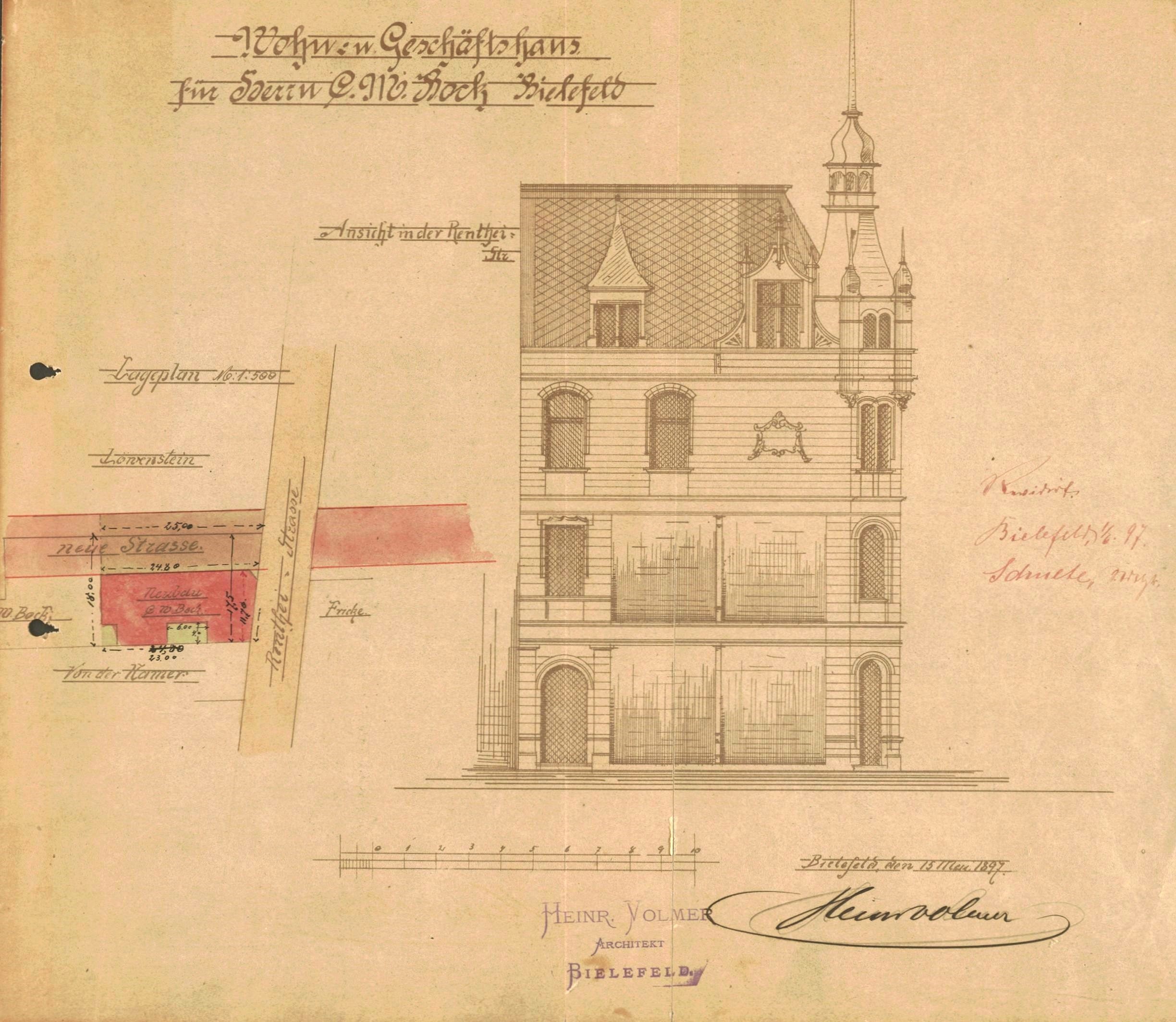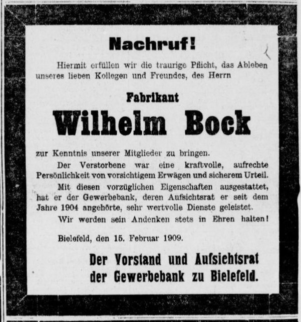 „Der unerbittliche Tod hat einem arbeitsamen Leben ein Ende bereitet, Herr Fabrikant C. W. Bock ist Sonnabend abend [sic] im 64. Lebensjahre […] gestorben […]. Der Verstorbene, ein Bielefelder Kind, hat es durch rastlosen Fleiß und unermüdliche Tätigkeit aus kleinen Anfängen heraus zu einer achtungsgebietenden Stellung in seiner Vaterstadt gebracht.“ So würdigte der Bielefelder General-Anzeiger am 15. Februar 1909 den zwei Tage zuvor verstorbenen Unternehmer Wilhelm Bock (1845-1909). Tatsächlich war es Bock nicht nur gelungen, das Korbwarengeschäft seines Vaters zu einem erfolgreichen Unternehmen auszubauen, sondern auch das gesellschaftliche Leben in seiner Heimatstadt durch ausgeprägtes politisches und soziales Engagement aktiv mitzugestalten. Darüber hinaus sollte er als Bauherr bleibende Spuren im Bielefelder Stadtbild hinterlassen.