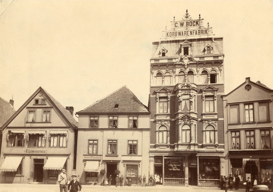 Da ihm die Geschäftsräume an der Güsenstraße weder hinsichtlich ihrer Lage, noch bezüglich ihrer Größe und Erweiterungsmöglichkeiten zusagten, entschied Wilhelm Bock bereits im Herbst 1875, den Sitz seines Geschäfts in das am Alten Markt gelegene Haus Markt 61 (seit 1882 Am Markt 8) zu verlegen – „eines der ältesten Häuser Bielefelds, das jedoch so unschön war, daß selbst meine Frau Bedenken trug, mir dorthin zu folgen. […] Meine Bekannten rieten mich [sic] von diesem Schritte ab. Es fehlte garnicht an allerhand düsteren Prophezeiungen. Doch ich ließ mich nicht irre machen. Ich bekam freilich schlechte Wohnräume, dagegen große und schöne Werkstatts- und Lagerräume. Nun stand nichts mehr im Wege, das Geschäfts auszudehnen.“ Die Ausdehnung war zunächst vor allem personeller Natur, da Bock die Belegschaft seines fortan als Korbwarenfabrik kategorisierten Geschäfts durch die Anstellung jungen Personals erheblich vergrößerte. Zeitweise befand sich in dem neuen Geschäftssitz am Alten Markt zusätzlich auch das Uhrmachergeschäft von Bocks Schwager Karl Plettenberg (1858-1932).