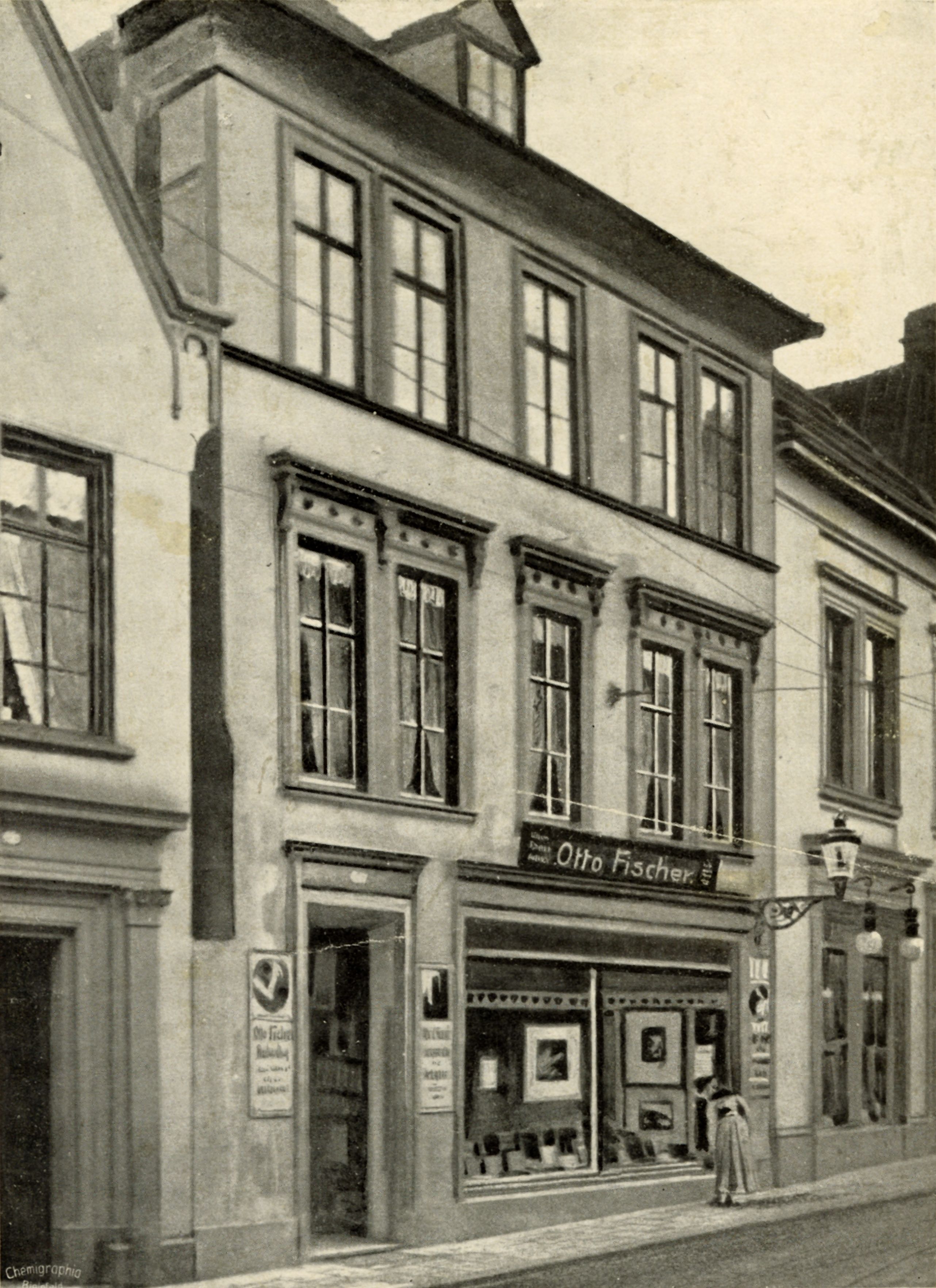 Die Buch- und Kunsthandlung blickte zu diesem Zeitpunkt bereits auf 25 Jahre Bestehen zurück. Gegründet hatte sie der damals 22-jährige Otto Fischer sen. am 1. Oktober 1901, ursprünglich als Vereinsbuchhandlung des CVJM. Doch schon bald stellte er das Geschäft, noch unter der Adresse Gehrenberg 2 firmierend, auf eigene Beine, baute das Sortiment erheblich aus und führte die Buchhandlung nach seinen eigenen Vorstellungen, ohne jedoch „die innere Verbindung mit den Kreisen der evangelischen Kirche abreißen zu lassen“, wie die Geschäftschronik 1951 festhielt. Fischer vereinte den pragmatischen Blick eines Kaufmanns mit dem ästhetischen Empfinden eines Künstlers und Literaten, was den anhaltenden Erfolg der neuen Buchhandlung erklärt.