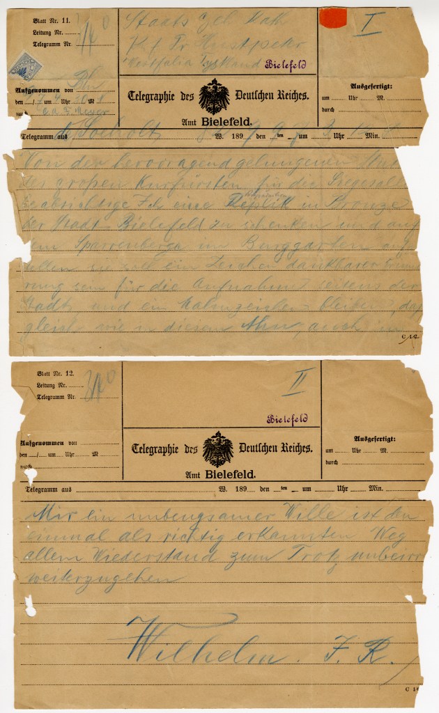 Am 9. Juli 1899 erhielt Georg Ernst Hinzpeter (1827-1908) in Bielefeld überraschend ein Telegramm aus dem dänischen Søholt. Absender war sein ehemaliger Zögling, der seit 1889 als Kaiser Wilhelm II. regierte und sich mit der Yacht „Hohenzollern“ auf einer seiner berühmten Nordlandreisen befand. Angekündigt wurde die Schenkung eines Bronzeabgusses, der „hervorragend gelungenen Statue des großen Kurfürsten für die Siegesallee“, die er am 13. Juni 1899 in Prof. Fritz Schapers (1841-1919) Atelier in Berlin gesehen hatte. Mit dieser Schenkung gedachte der Kaiser sich für den freundlichen Empfang in Bielefeld 1897 zu revanchieren. Eigentlich hatte der vormalige Prinzenerzieher Hinzpeter beim Kaiser nur die Aufhängung einer Erinnerungstafel an dieses Ereignis angeregt, die mit der ungleich großzügigeren kaiserlichen Gabe aber in den Hintergrund rückte. Schon drei Tage später bedankte sich Oberbürgermeister Gerhard Bunnemann (1842-1925) artig für das opulente Geschenk, das einen in der Stadt schon lange gehegten Wunsch nach einem Denkmal für Kurfürst Friedrich Wilhelm von Brandenburg (1620-1688) erfülle, womit der Zauber der kaiserlichen Initiative freilich etwas verloren ging.