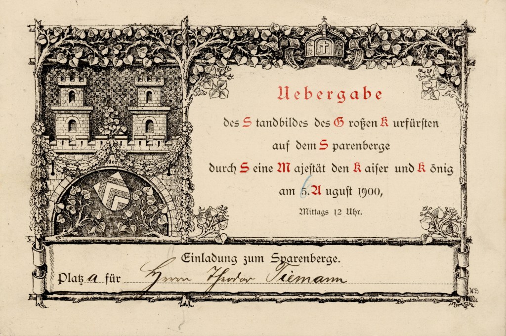- 400,10/Zeitgeschichtliche Sammlung, Nr. 8678: Einladungskarte zur Einweihung des Denkmals „Der Große Kurfürst“, 1900