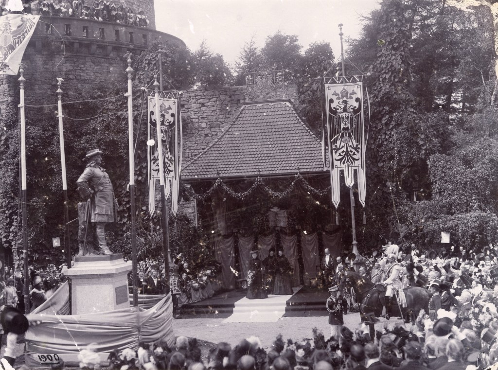 Empfangen wurde die Gesellschaft auf der Sparrenburg vom versammelten Bielefelder Establishment bestehend aus Stadtverordneten und Magistratsmitgliedern, Unternehmern, kirchlichen und schulischen Vertretern, Militärs sowie höheren Beamten samt Oberpräsident und Landeshauptmann aus Münster, Regierungspräsident aus Minden und Landrat, allen voran aber der Gastgeber Oberbürgermeister Bunnemann mit Amtskette. Auf der städtischen Ehrengästeliste fehlten Vertreter von Gewerkschaften und anderen Arbeiterverbänden, aber auch Namen wie August Oetker, dessen Geschäft offensichtlich noch nicht bedeutsam genug war. Eine Ehrenformation des Garnisonsregiments Nr. 55 und eine Militärkapelle rahmten den Anlass akkurat, eine im vermeintlichen Stil des 17. Jahrhunderts gekleidete Fußgruppe folkloristisch und 1.000 Posaunenbläser musikalisch. Der Ablauf folgte dem festgelegten Protokoll: Blumenübergabe – Aufsagen eines Gedichts von Frida Schanz (1859-1944) – Reden – Enthüllung – „Hurra!“ – Eichenpflanzung – Abrücken zum Kaffeetrinken bei Hinzpeter.