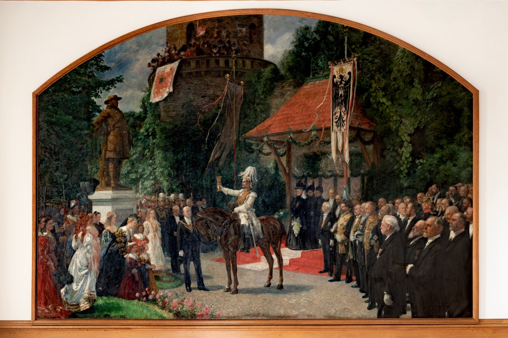 Ähnlich monumental und zugleich exklusiv präsentiert sich der am 6. August 1900 gezeigte Stadt- und Bürgerstolz noch heute im Alten Rathaus. Im früheren Magistratssitzungszimmer, späteren Kleinen Ratssaal und heutigen Nahariyaraum hängt ein (mit umlaufendem, 5,5 cm breitem Rahmen) 413 x 295 cm messendes Großgemälde des auf Historienmalerei spezialisierten Malers und Illustrators William Pape (1859-1920) aus Berlin, das die Denkmalenthüllung zeigt. Gestiftet haben es für 1.200 Reichsmark die Bielefelder Verlagsbuchhändler Johannes Klasing (1846-1927) und Wilhelm Velhagen (1850-1910). Es entstand 1902/03 auf Grundlage eines Fotos, aber auch einer Temperaskizze des für Velhagen & Klasing wiederholt engagierten Johannes Gehrts (1855-1921) kombiniert mit Einzelporträts, für das die wiedergegebenen Persönlichkeiten eigens in Papes Atelier im Berliner Reichstag zu reisen oder im Sommer 1903 in Bielefeld Porträt zu stehen hatten.