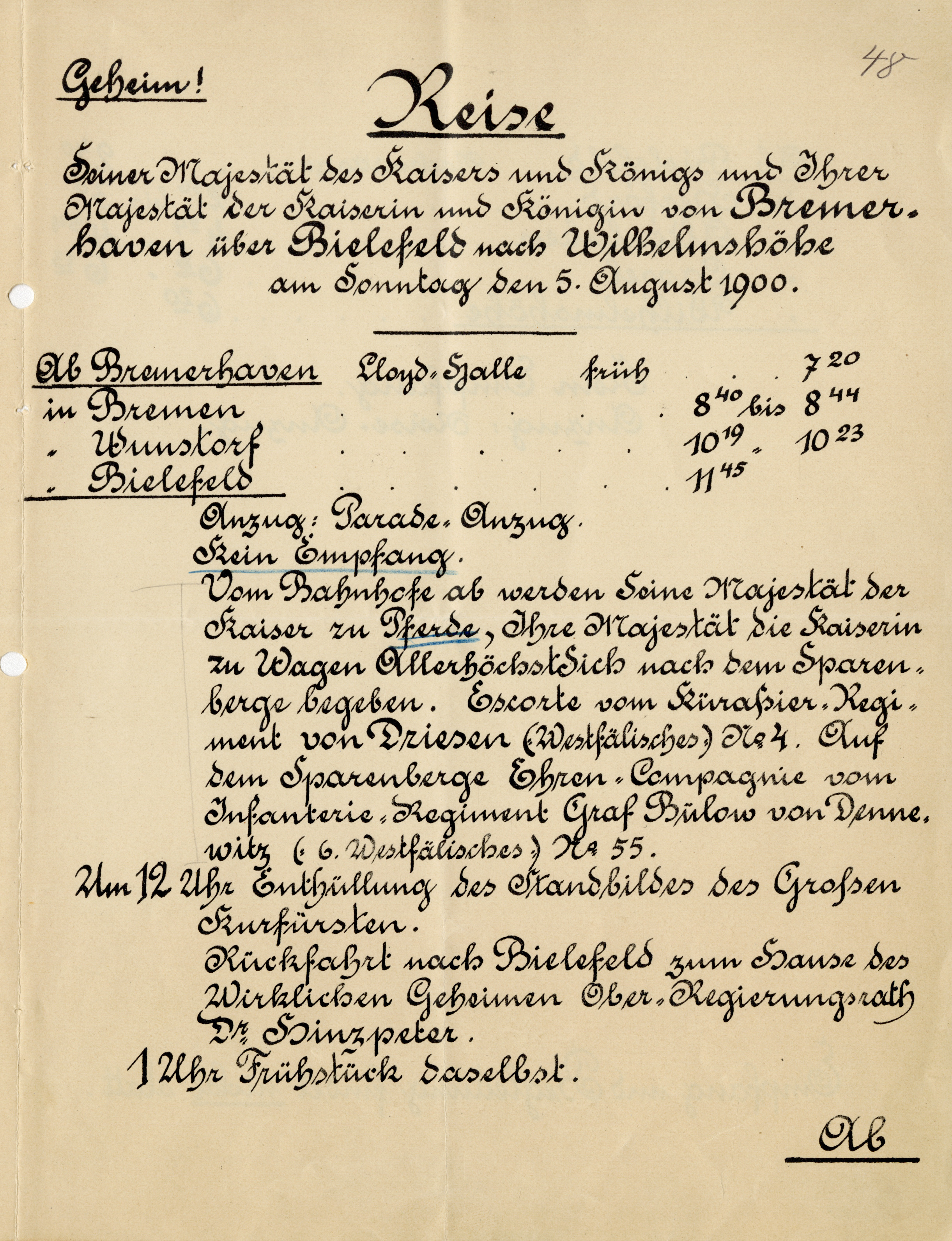 Die Terminfindung für Bielefeld hing vollends von den Planungen des Kaisers ab, der in Bremerhaven weiterhin Verbände nach China verabschiedete, dann aber vorzeitig nach Kassel-Wilhelmshöhe abreisen musste. Ausschlaggebend war nicht das Attentat auf den italienischen König Umberto I., der am 29. Juli 1900 in Monza erschossen worden war und am 9. August 1900 in Rom beigesetzt werden sollte, sondern vielmehr der Tod von Herzog Alfred von Sachsen-Coburg und Gotha am 30. Juli 1900. Wilhelm II. und Alfred waren miteinander verwandt, was angesichts der bekanntermaßen biologisch beengten Heiratspolitik des europäischen Hochadels kaum überraschen muss: Alfred war ein Sohn Queen Victorias und damit ein Bruder der Mutter von Wilhelm II., also sein Onkel. Vorzeitig verließ der Kaiser Bremerhaven am 3. August in Richtung Kassel-Wilhelmshöhe, um am Folgetag zur Beerdigung nach Coburg zu fahren.