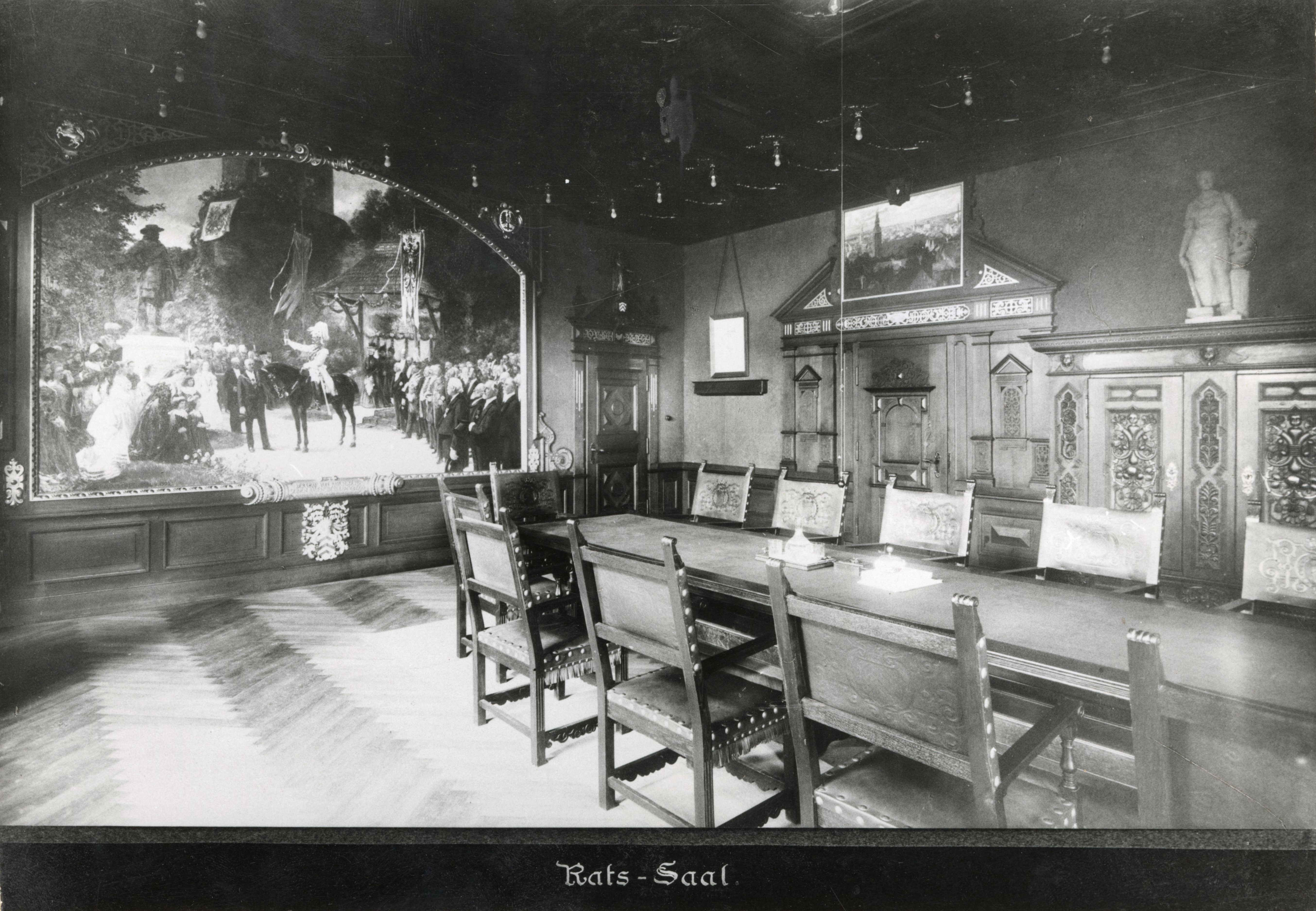 Ähnlich monumental und zugleich exklusiv präsentiert sich der am 6. August 1900 gezeigte Stadt- und Bürgerstolz noch heute im Alten Rathaus. Im früheren Magistratssitzungszimmer, späteren Kleinen Ratssaal und heutigen Nahariyaraum hängt ein (mit umlaufendem, 5,5 cm breitem Rahmen) 413 x 295 cm messendes Großgemälde des auf Historienmalerei spezialisierten Malers und Illustrators William Pape (1859-1920) aus Berlin, das die Denkmalenthüllung zeigt. Gestiftet haben es für 1.200 Reichsmark die Bielefelder Verlagsbuchhändler Johannes Klasing (1846-1927) und Wilhelm Velhagen (1850-1910). Es entstand 1902/03 auf Grundlage eines Fotos, aber auch einer Temperaskizze des für Velhagen & Klasing wiederholt engagierten Johannes Gehrts (1855-1921) kombiniert mit Einzelporträts, für das die wiedergegebenen Persönlichkeiten eigens in Papes Atelier im Berliner Reichstag zu reisen oder im Sommer 1903 in Bielefeld Porträt zu stehen hatten.