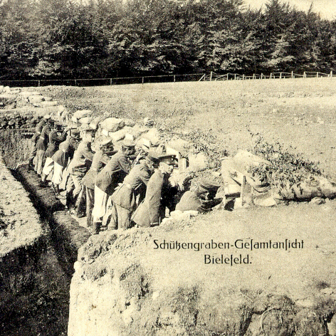 • Dr. Jochen Rath, Stadtarchiv und Landesgeschichtliche Bibliothek • Es war ein seltsames Sonntagsvergnügen, das seit Sommer 1915 die Bielefelder auf die Ochsenheide lockte. Bei Sonnenschein und mit Spazierstock pilgerten Familien in Scharen auf die südwestlich der Stadt gelegene Anhöhe: Am letzten Juniwochende 1915 eröffnete ein Schauschützengraben für das Publikum die Pforten. Der bürgerliche … Weiterlesen 26./27. Juni 1915: Eröffnung des Schauschützengrabens auf der Ochsenheide